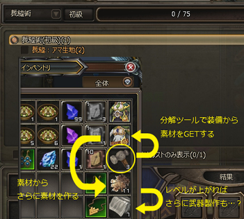 素材から素材作成→レベルが上がると作れるものが増える感じ。